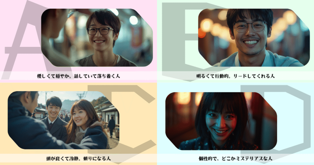 | ⚡Bタイプ | 明るくポジティブ | 行動的でリードしてくれる人 | 意見を伝え合うことを大切に |