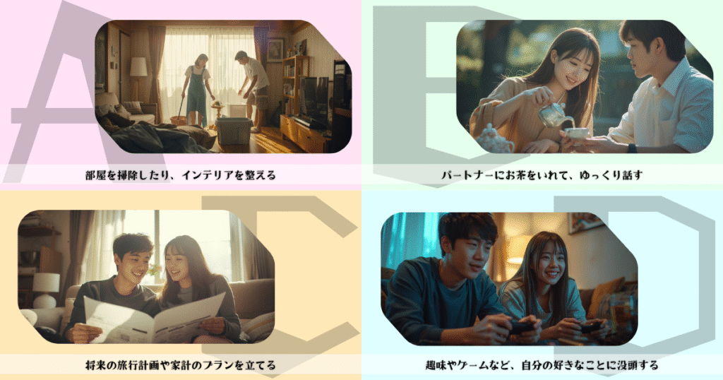 💭質問:休日の午後、家の中でのんびり過ごすあなた。ふと時間ができたときにする行動はどれ?