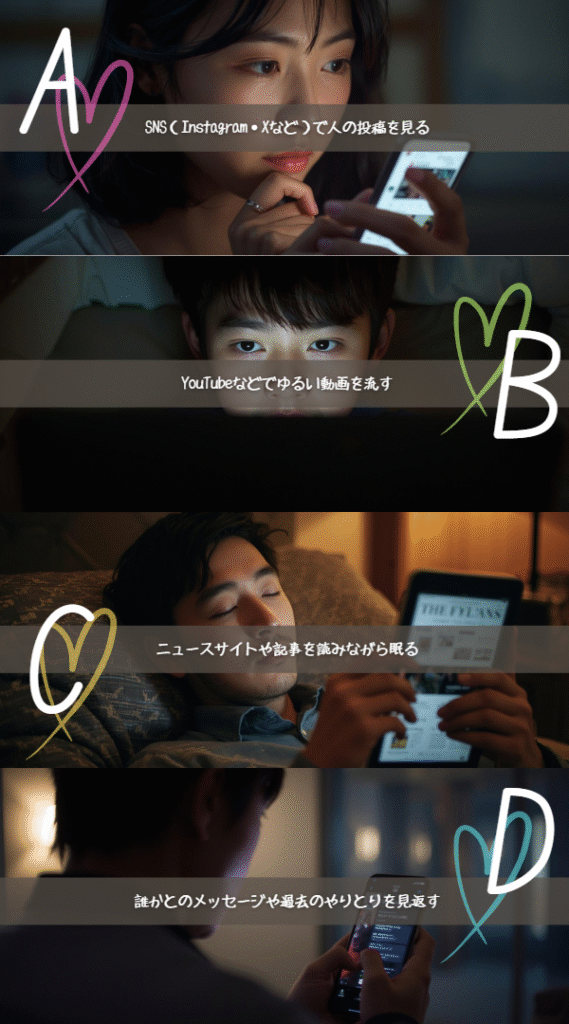 夜、眠る前についスマホで見てしまうものはどれですか?